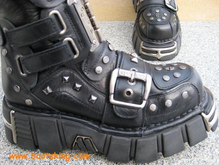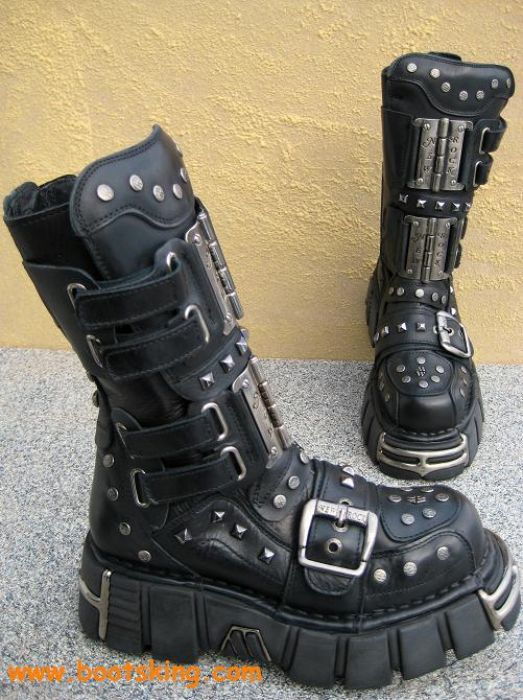 New Rock Stiefel "Kenobi" schwarz aus Leder mit einer Schnallen, vier Klettverschlüssen, Metalbeschlägen und Reißverschuß. Handgearbeiteter Stiefel aus Spanien.