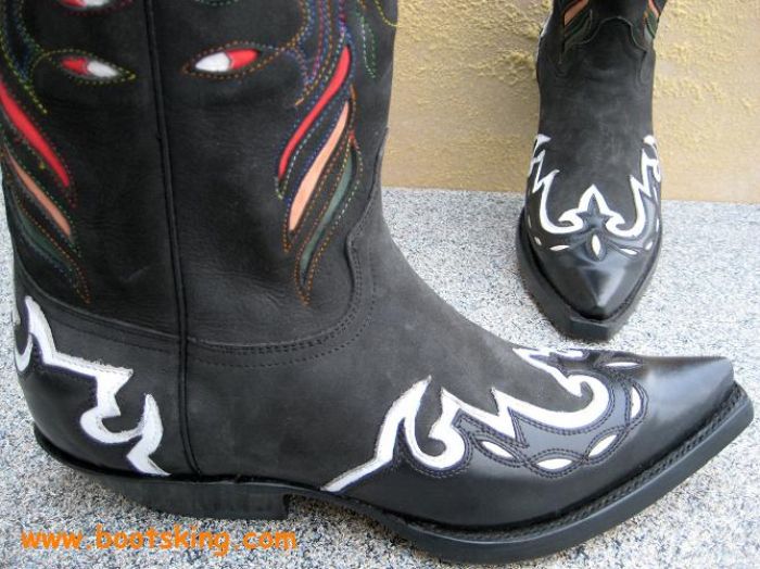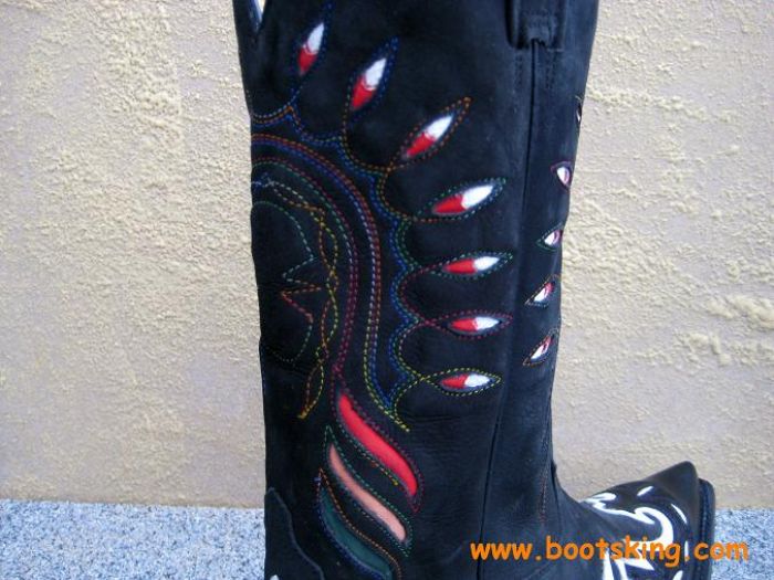 Hochwertig verarbeitete Rahmengenähte (Good Years Welted) Cowboystiefel aus bestem schwarzem Nubukleder, aufgebaut auf einer Ledersohle, verziert mit Applikationen aus schwarzen und weißem Leder und schönen Stickereien, in Handarbeit hergestellt in Mexiko von Mezcalero Boots.
