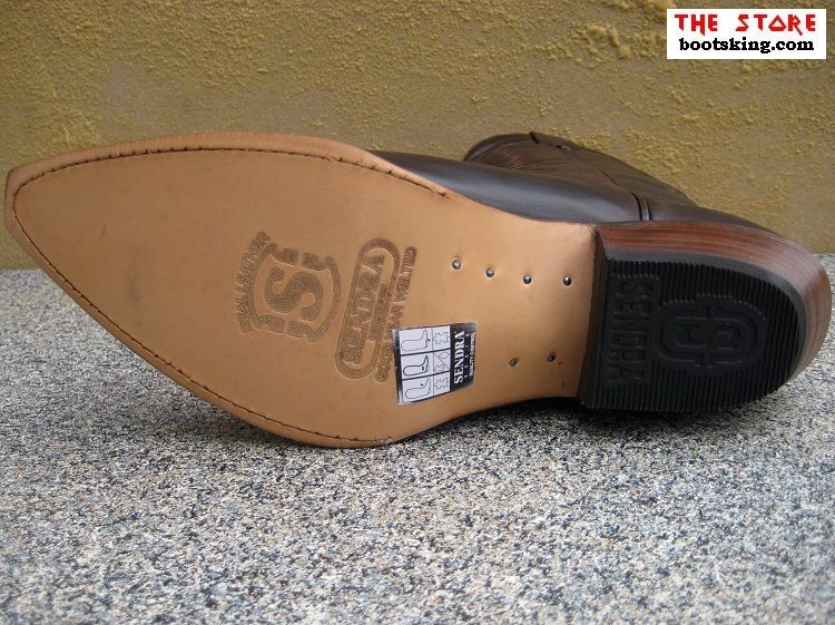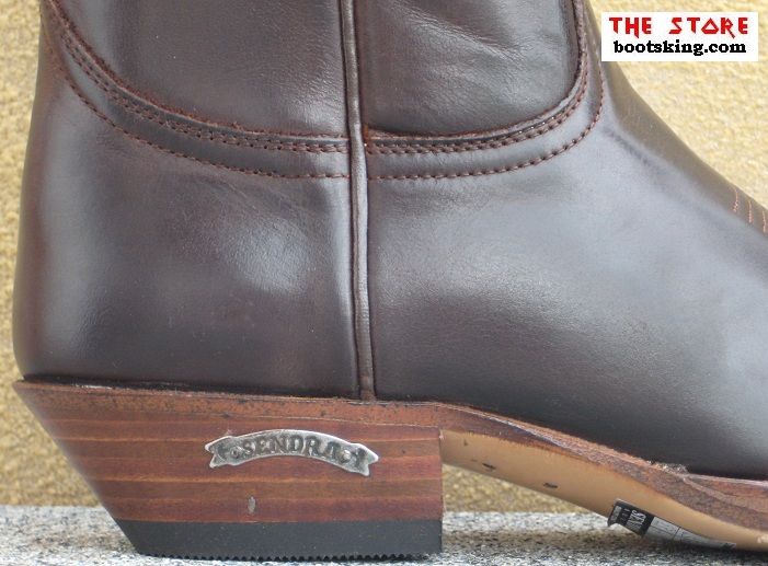 Hochwertig verarbeitete Rahmengenähte (Good Years Welted) Cowboystiefel aus bestem dunkelbraunem Nappa Oberleder mit Ziernähten auf dem Spann und einer Ledersohle, in Handarbeit hergestellt in Spanien von Sendra.