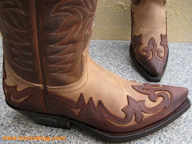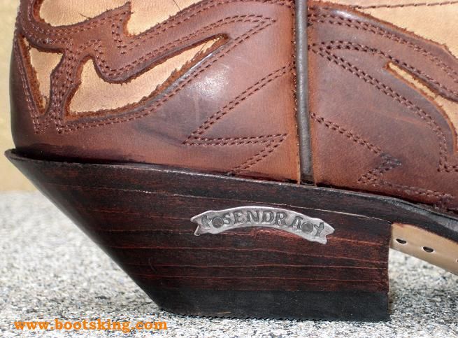 Hochwertig verarbeitete Rahmengenähte (Good Years Welted) klassische Cowboystiefel, die Applikationen und der Schaft sind aus braunem göltem Nubukleder, der Fußbereich ist aus einem hellbraunem geöltem Nubukleder, aufgebaut auf einer Ledersohle, in Handarbeit hergestellt in Spanien von Sendra.