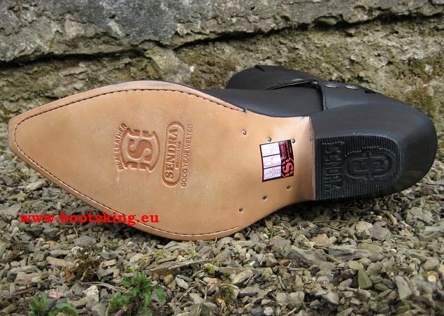 Hochwertig verarbeitete Rahmengenähte (Good Years Welted) Cowboystiefel aus bestem schwarzem Oberleder, verziert mit Lederriemen und Metallring um den Stiefel aufgebaut auf einer Ledersohle, in Handarbeit hergestellt in Spanien von Sendra.