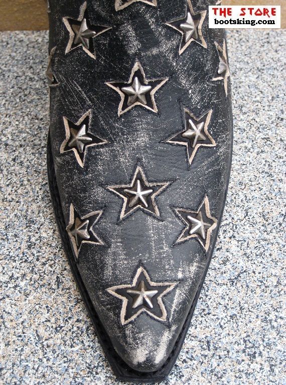 Hochwertig verarbeitete Rahmengenähte (Good Years Welted) Western Stiefelette aus bestem auf antik gebürstetem blauem Nappaleder, versehen mit dekorativen Metalsternen ist dieser Westernstiefel aufgebaut auf einer Ledersohle, an der Innenseite dieser Stiefellette ist ein Reißverschluss eingearbeitet.
