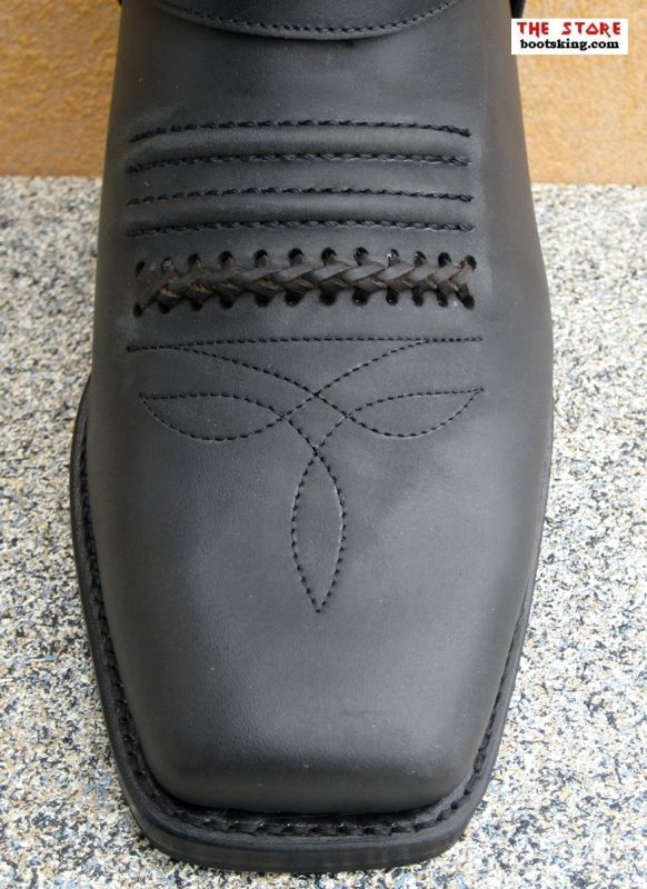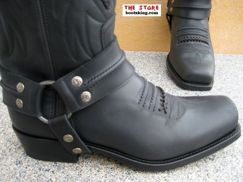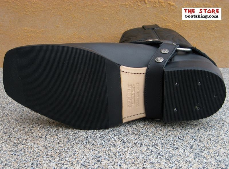 Hochwertig verarbeitete Rahmengenähte (Good Years Welted) Biker Boots aus bestem schwarzem Nubukleder, aufgebaut auf einer Ledersohle, dekoriert mit schönen Stickereien und versehen mit einem Stiefelband. Bei dieses Model ist schon eine Kunststoffsohle unter der Ledersohle angebracht. In Spanien bei Sendra in Handarbeit hergestellte Stiefel.