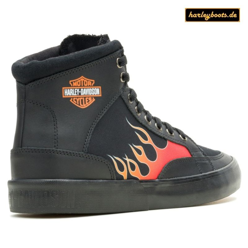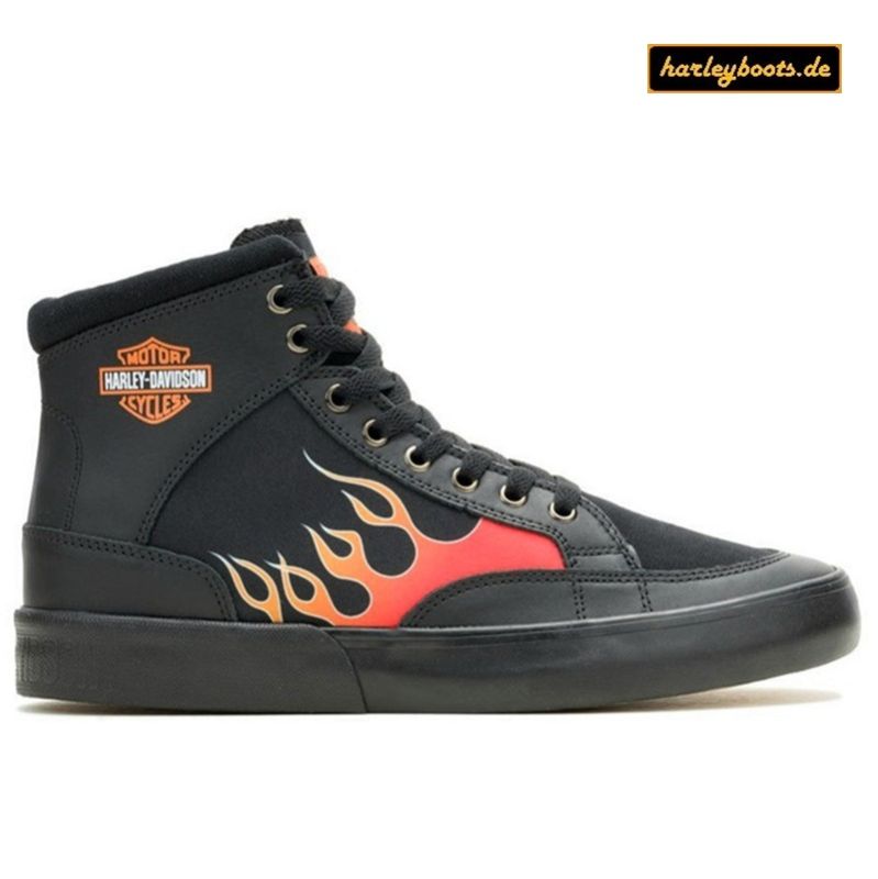 Hochwertig verarbeitete Schnürschuh aus feinem schwarzen Canvas Stoff mit Flammen sowie Harley Davidson Bar & Shield Aufdruck, aufgebaut auf einer spezielen Gummisohle welche nicht so schnell verschleisst und inne ein sehr weiches Fußbett hat.